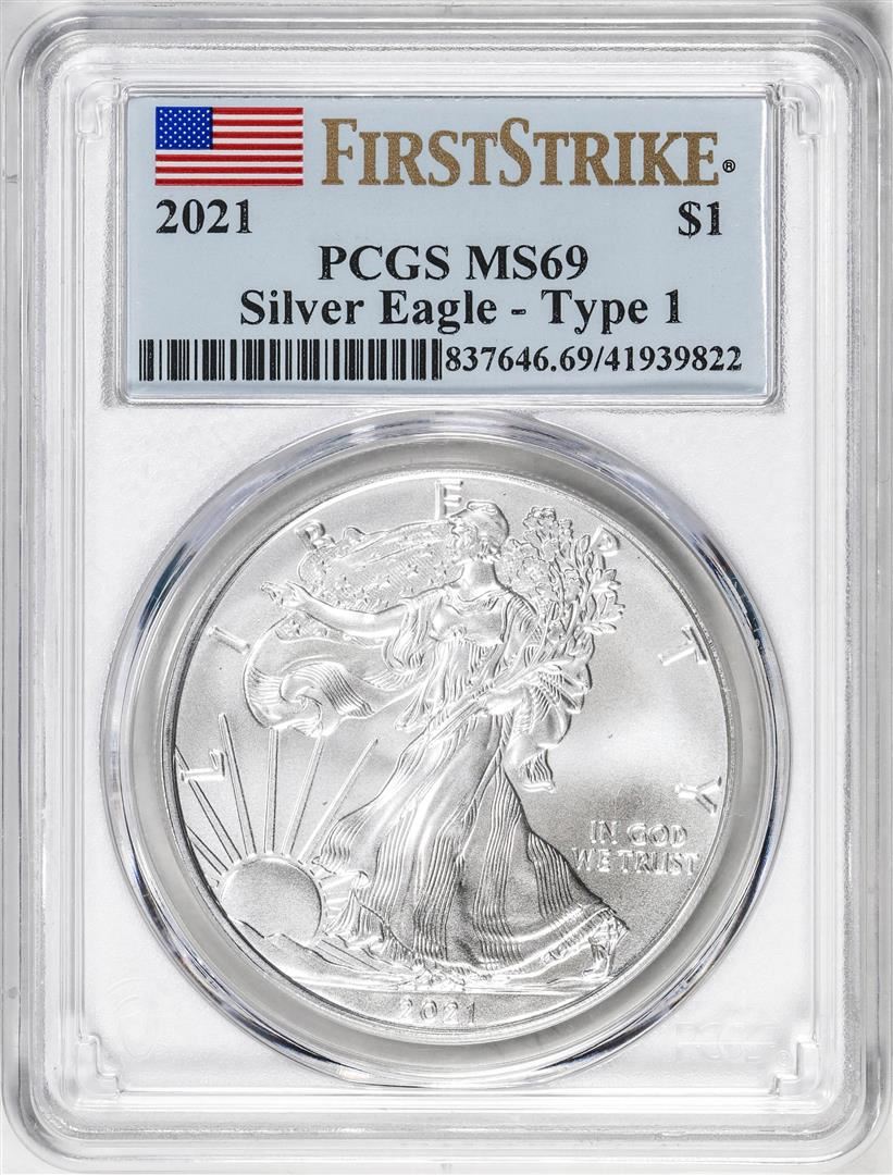 One 2021 Type 1 $1 American Silver Eagle Coin PCGS MS69. PCGS Graded.