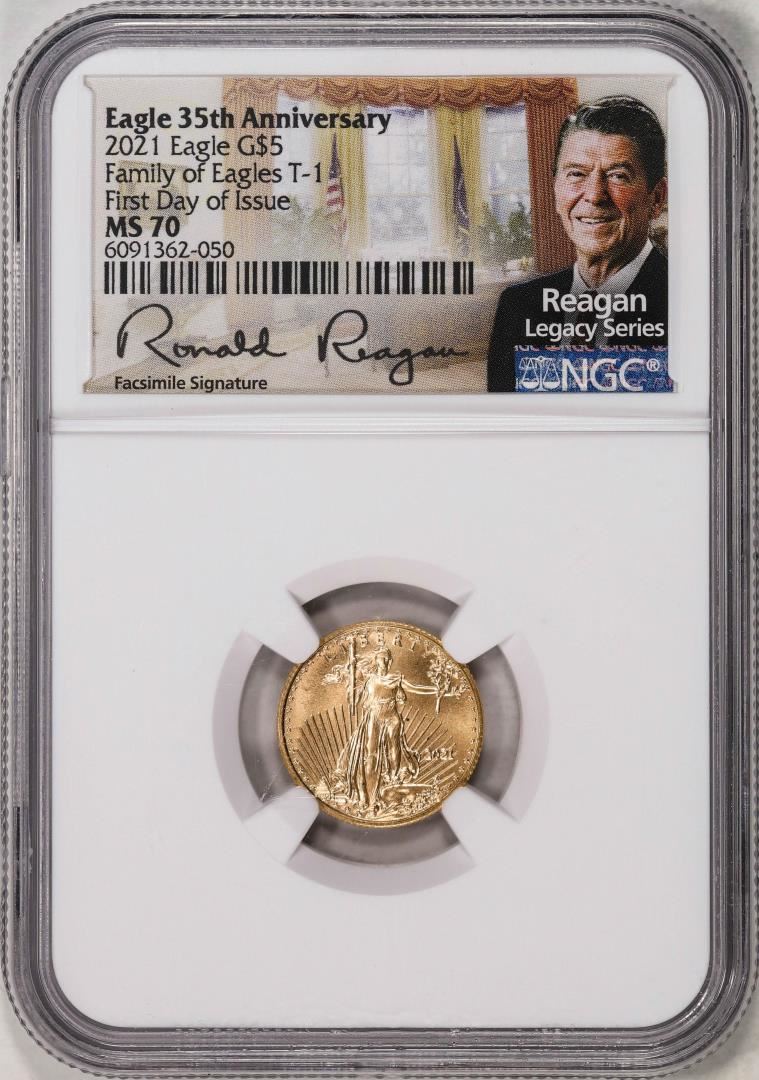2021 Type 1 $5 American Gold Eagle Coin NGC MS70 FDOI Ronald Reagan Signature