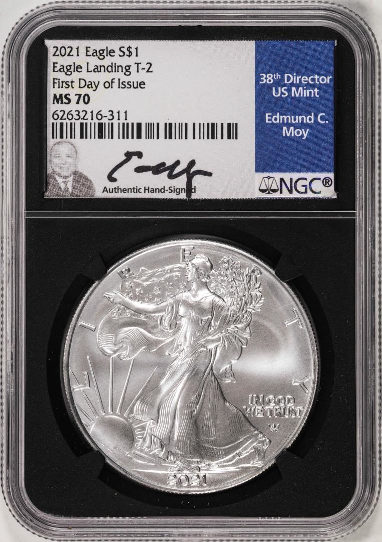 2021 Type 2 $1 American Silver Eagle Coin NGC MS70 FDOI Edmund Moy Signature
