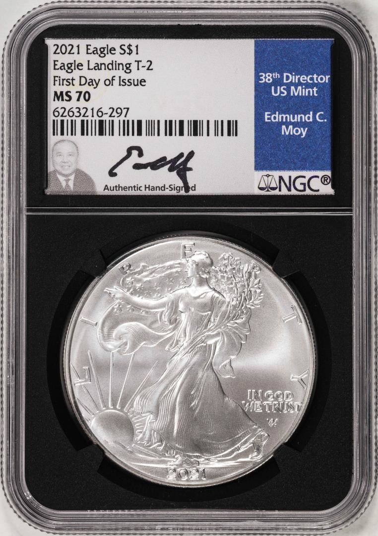 2021 Type 2 $1 American Silver Eagle Coin NGC MS70 FDOI Edmund Moy Signature