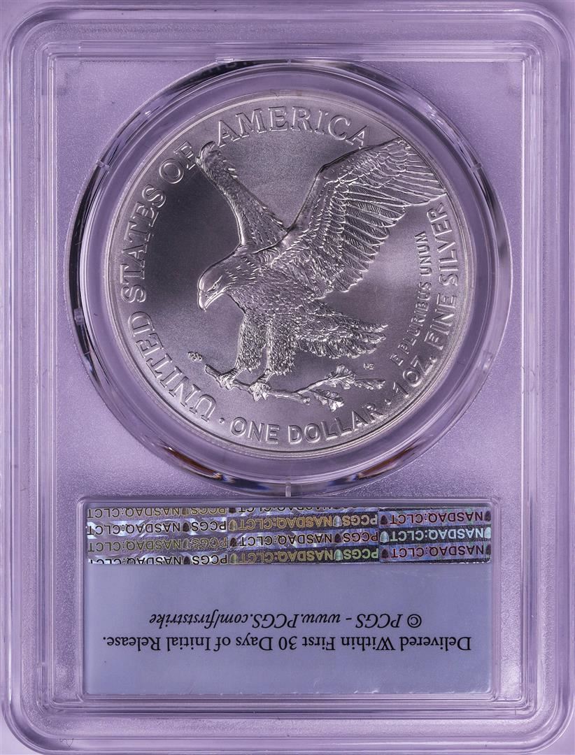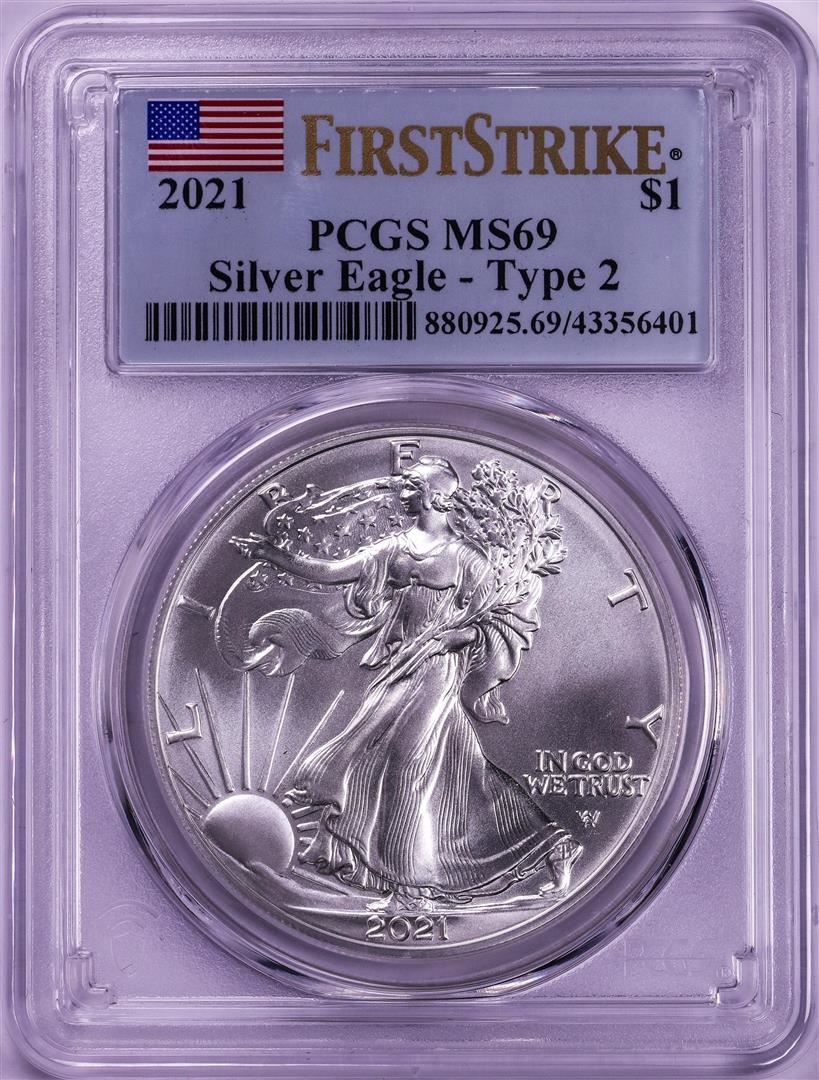 One 2021 Type 2 $1 American Silver Eagle Coin PCGS MS69 First Strike.