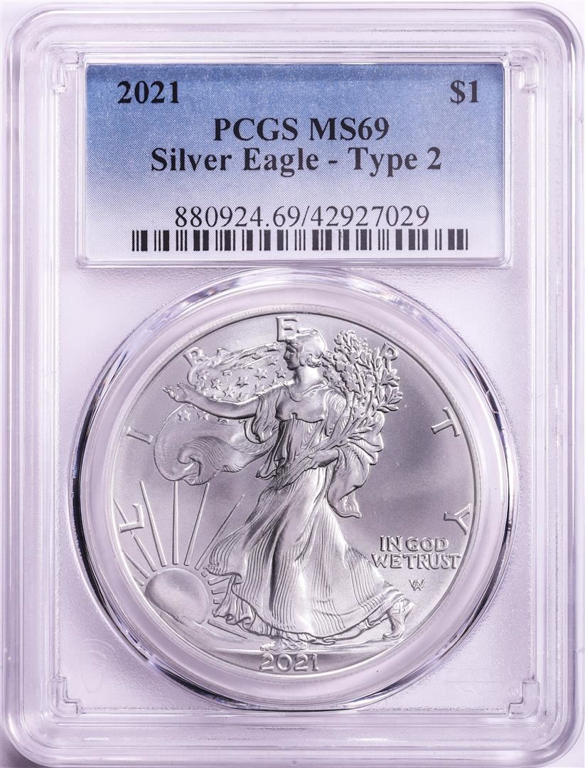One 2021 Type 2 $1 American Silver Eagle Coin PCGS MS69. PCGS Graded.