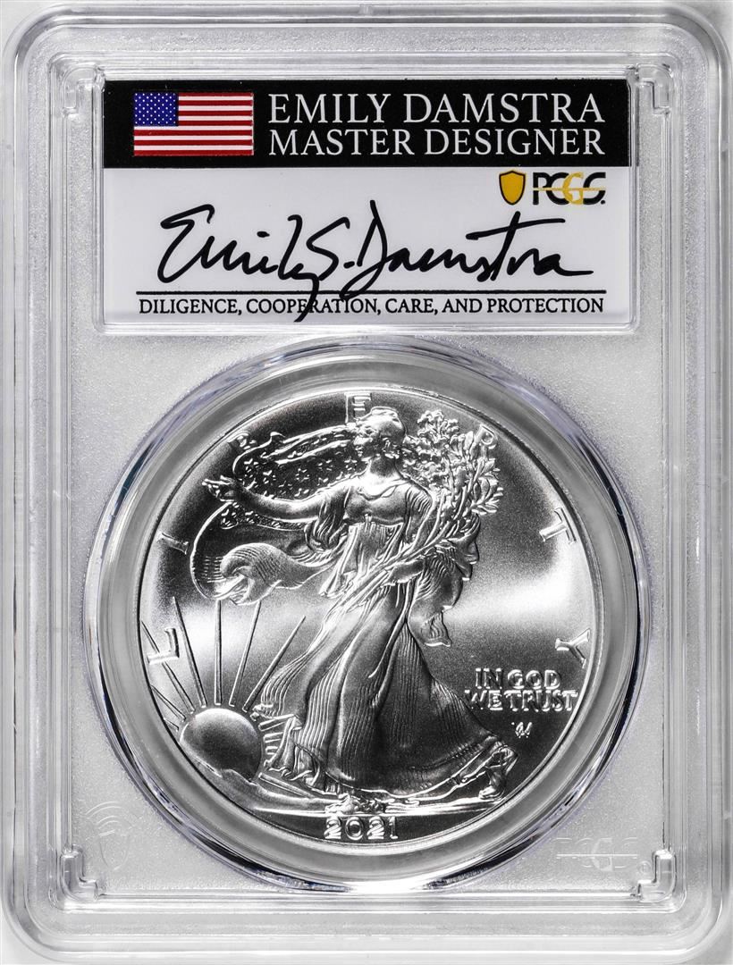 One 2021 Type 2 $1 American Silver Eagle Coin PCGS MS70 Damstra Signature First Strike. PCGS Graded.