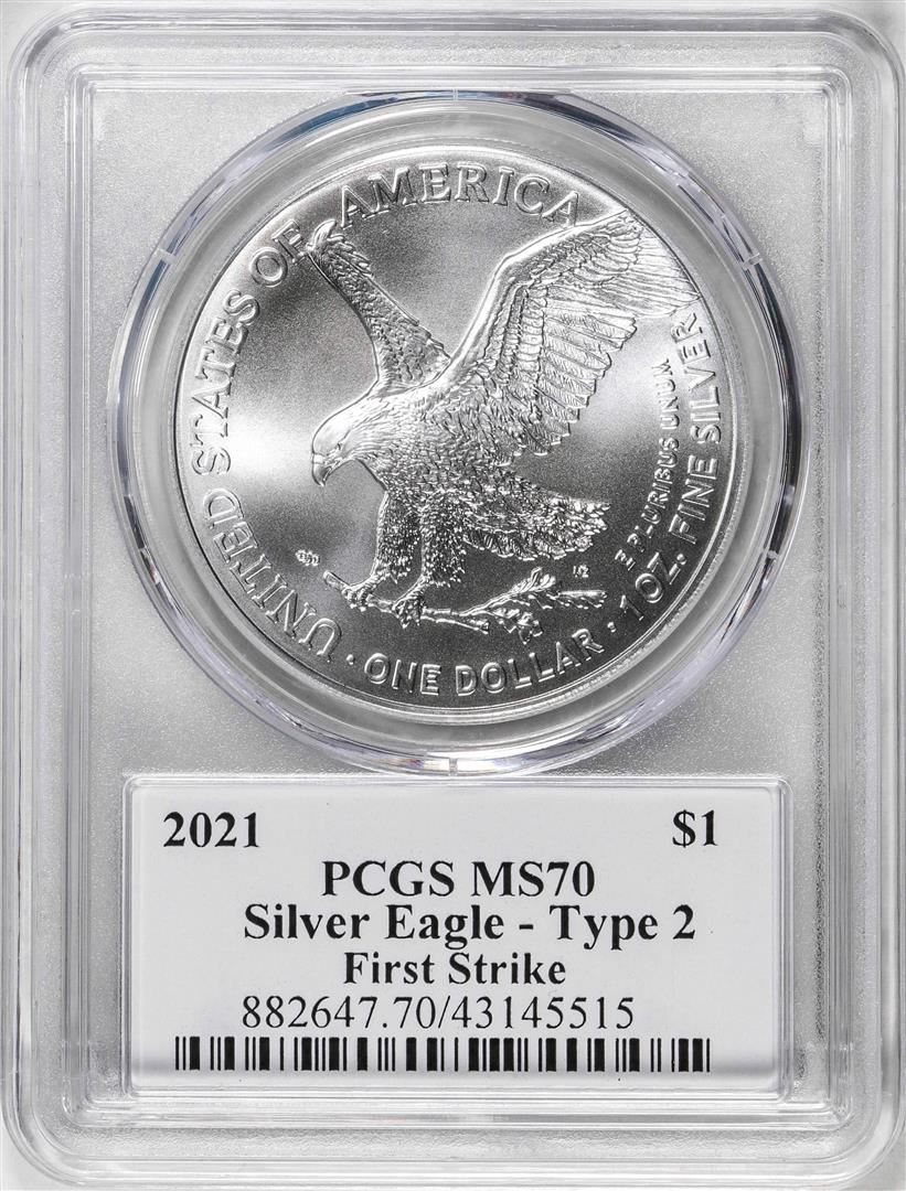 2021 Type 2 $1 American Silver Eagle Coin PCGS MS70 Damstra Signature First Strike