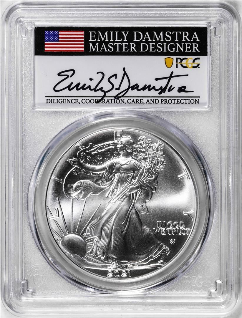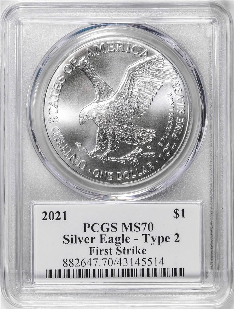 2021 Type 2 $1 American Silver Eagle Coin PCGS MS70 Damstra Signature First Strike