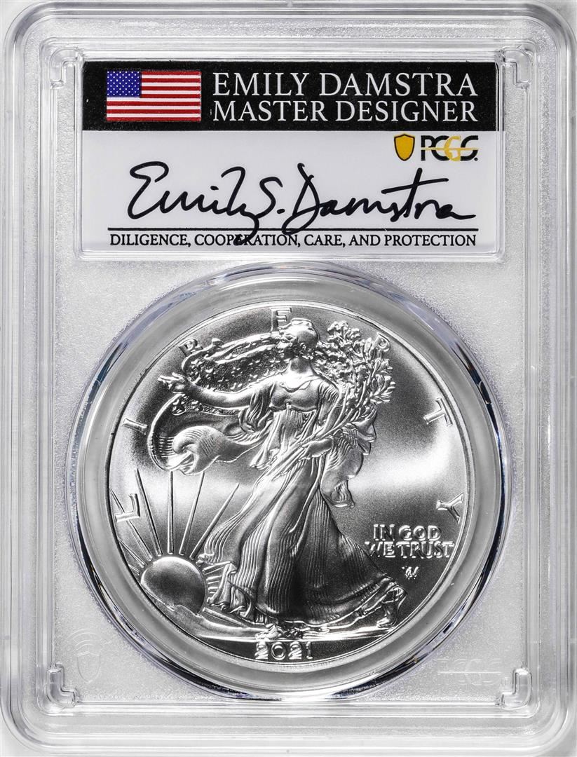 One 2021 Type 2 $1 American Silver Eagle Coin PCGS MS70 Damstra Signature First Strike. PCGS Graded.