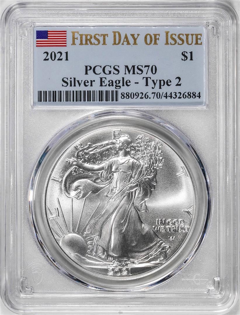 2021 Type 2 $1 American Silver Eagle Coin PCGS MS70 First Day of Issue
