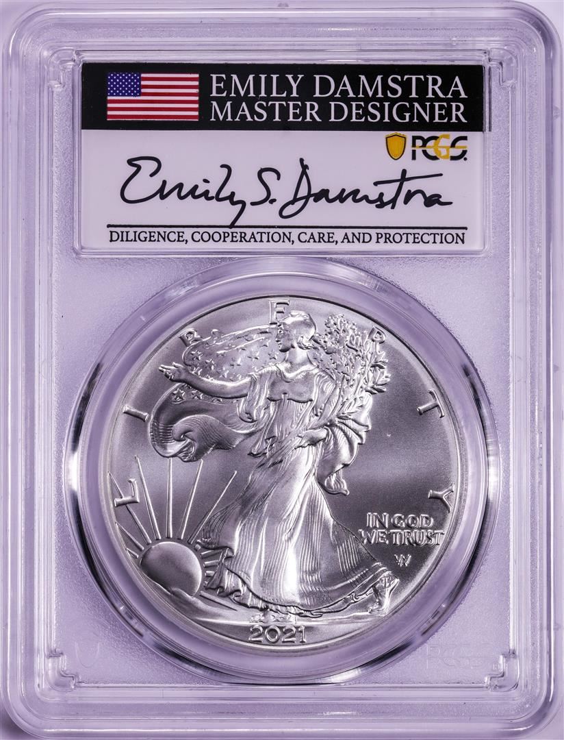 One 2021 Type 2 $1 American Silver Eagle Coin PCGS MS70 First Strike Damstra Signature. PCGS Graded.