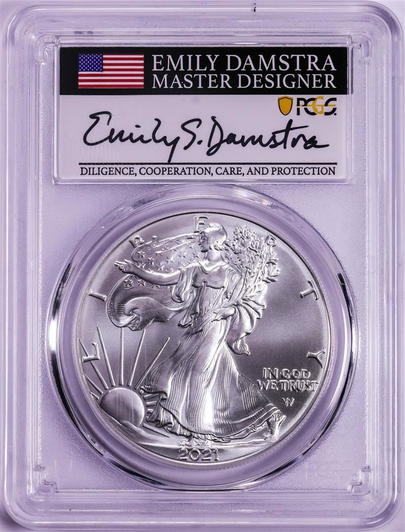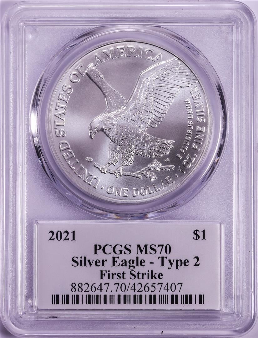 One 2021 Type 2 $1 American Silver Eagle Coin PCGS MS70 First Strike Damstra Signature. PCGS Graded.