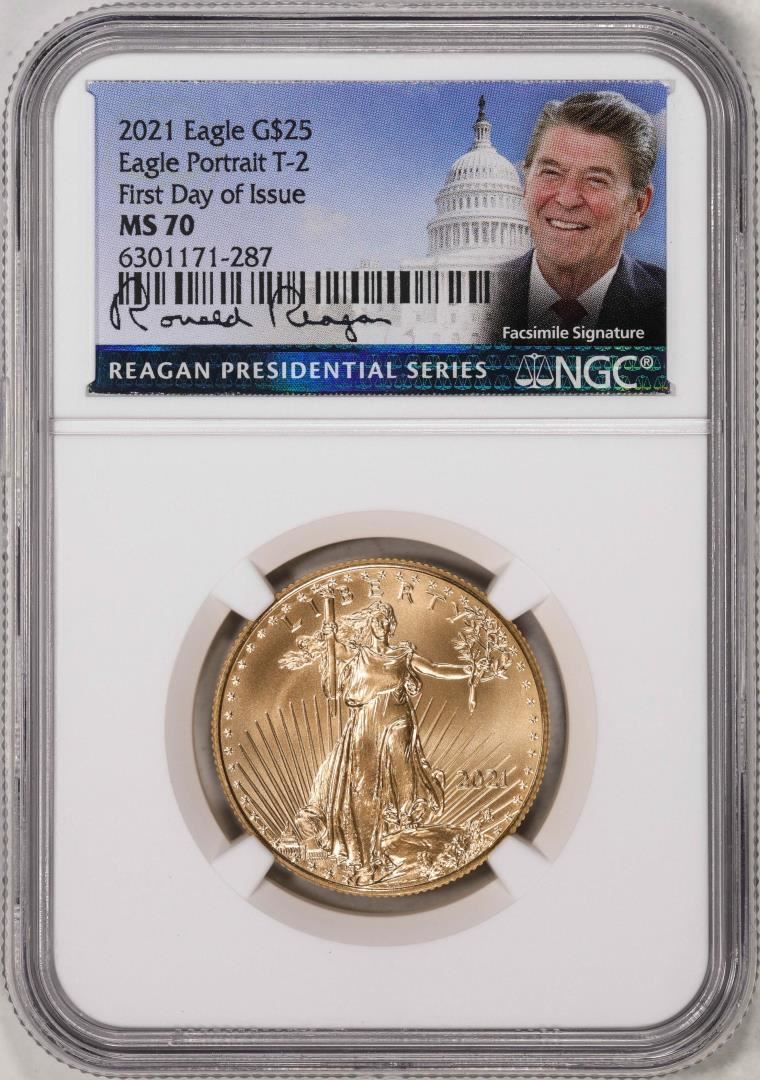 One 2021 Type 2 $25 American Gold Eagle Coin NGC MS70 FDOI Reagan Facsimile Signature. NGC Certified.