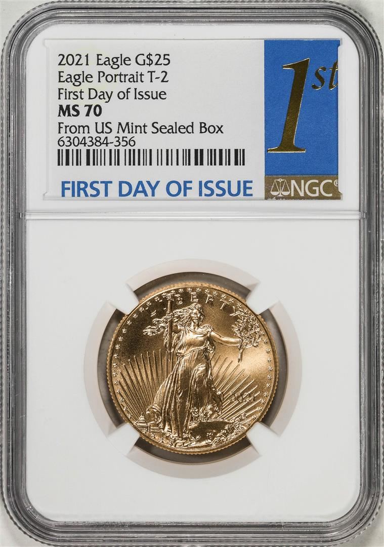 One 2021 Type 2 $25 American Gold Eagle Coin NGC MS70 First Day of Issue. NGC Certified.