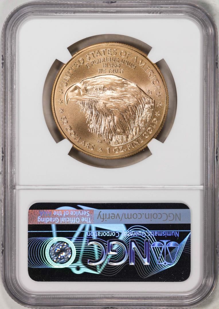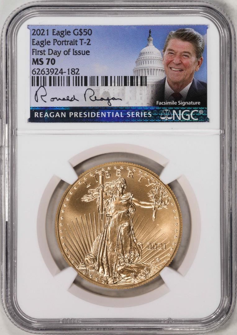 One 2021 Type 2 $50 American Gold Eagle Coin NGC MS70 FDOI Reagan Facsimile Signature. NGC Certified.