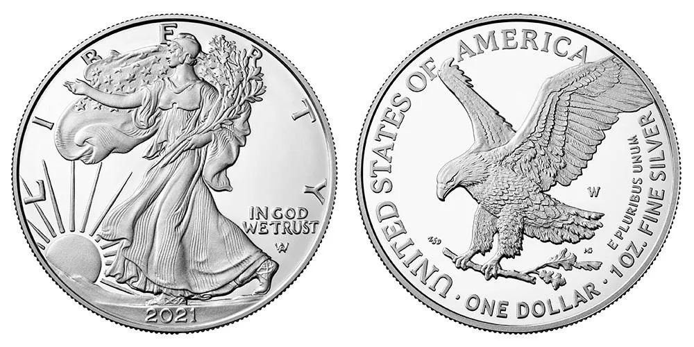 One 2021 Type-2 American .999 Fine Silver Eagle Dollar Coin.