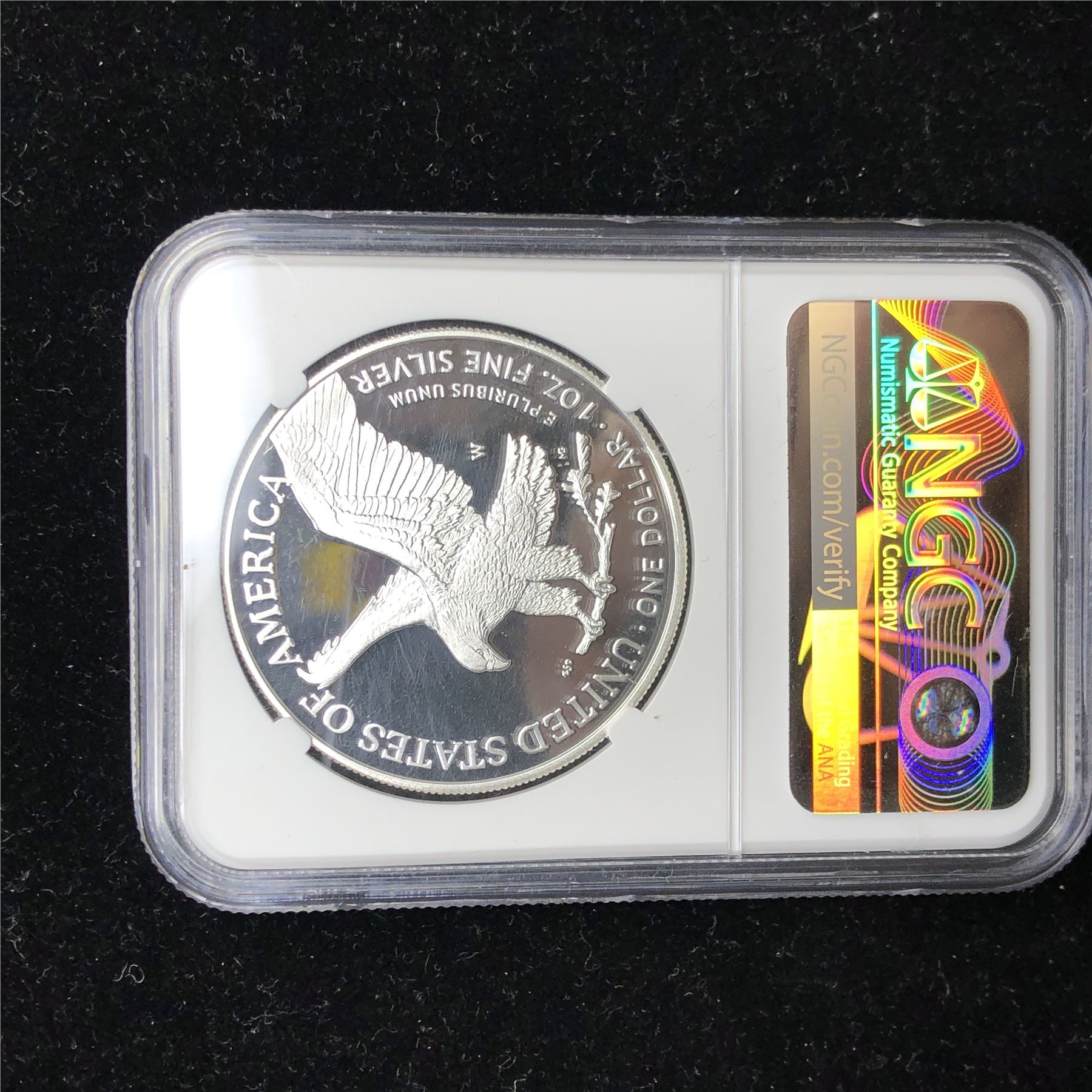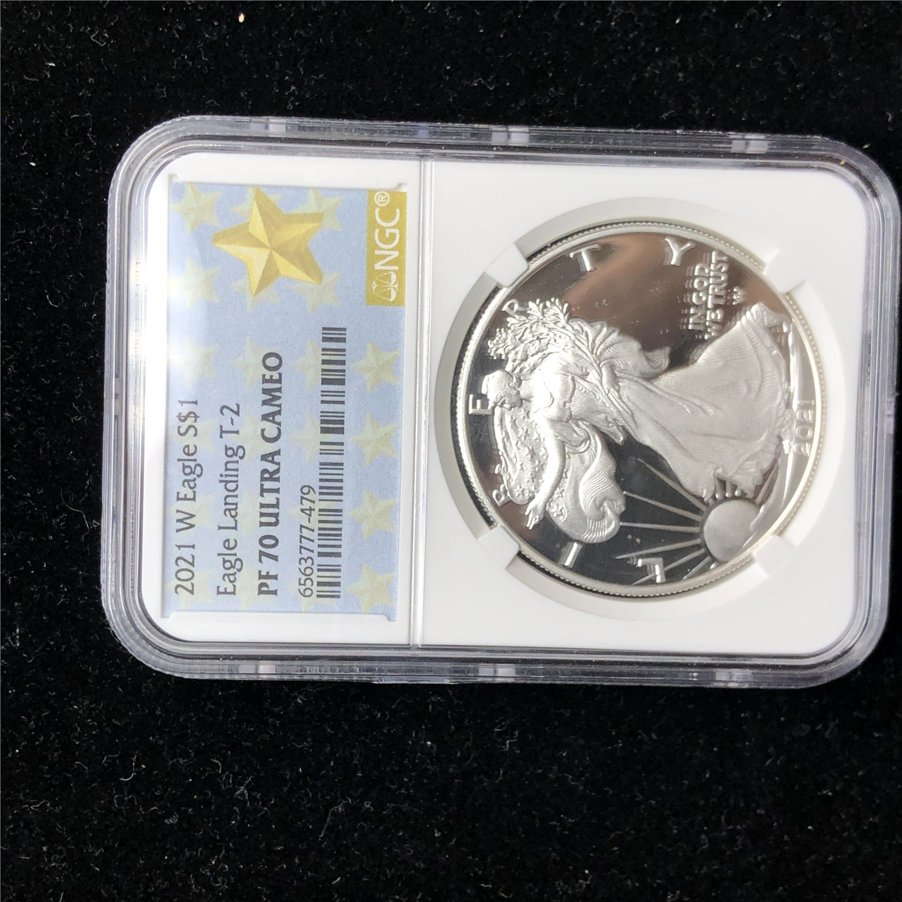 A 2021 Type 2 Proof US American Silver Eagle Dollar NGC PF70& nbsp; Ultra Cameo Gold Star Label . A perfect looking One Ounce .999 Proof Silver Eagle, and the First of the Type 2 Eagle Landing Reverse Issues. A perfectly graded coin in MS 70 - Great collectability as all MS 70& nbsp; graded US Eagles are more in demand.