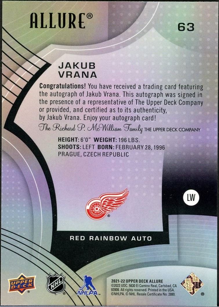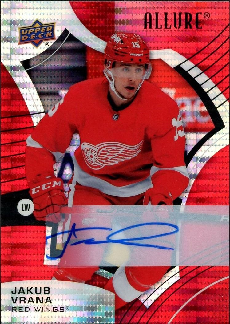 2021-22 UD Allure Red Rainbow autograph parallel of Detroit Redwings forward Jakub Vrana