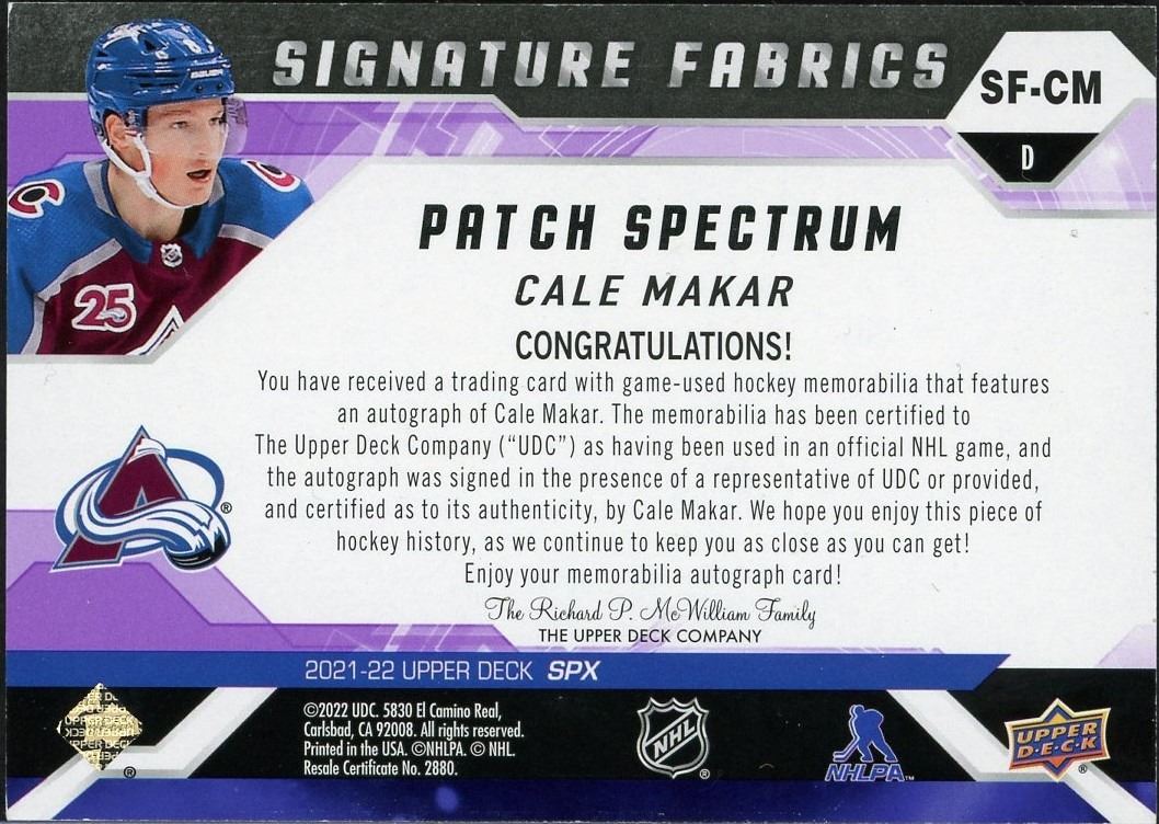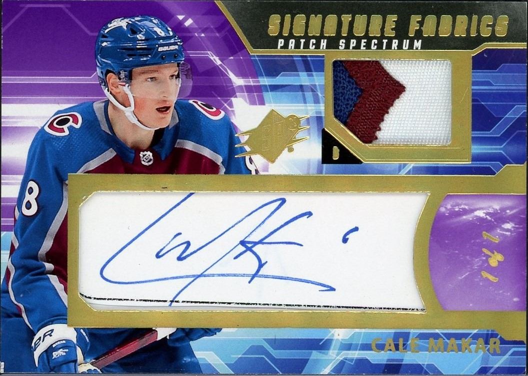 2021-22 Upper Deck SPX 1 of 1 three color auto graph patch card of top NHL Dman Cale Makar of the Colorado Avalanche. These 1 of 1 cards rarely become available and this is your chance to own a solid piece to any hockey collection!