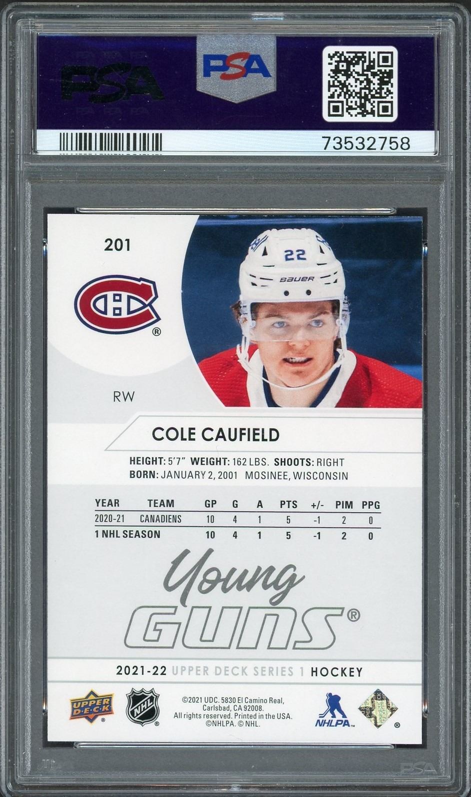 2021-22 UD Young Guns rookie of star Montreal Canadiens forward Cole Caufield graded a Gem mint 10 by PSA!