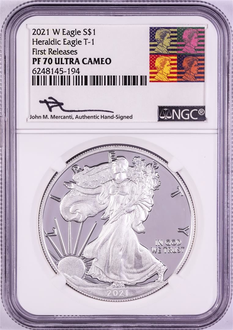 One 2021-W $1 Proof Heraldic Silver Eagle Coin NGC PF70 Ultra Cameo Mercanti Signature. NGC Certified.