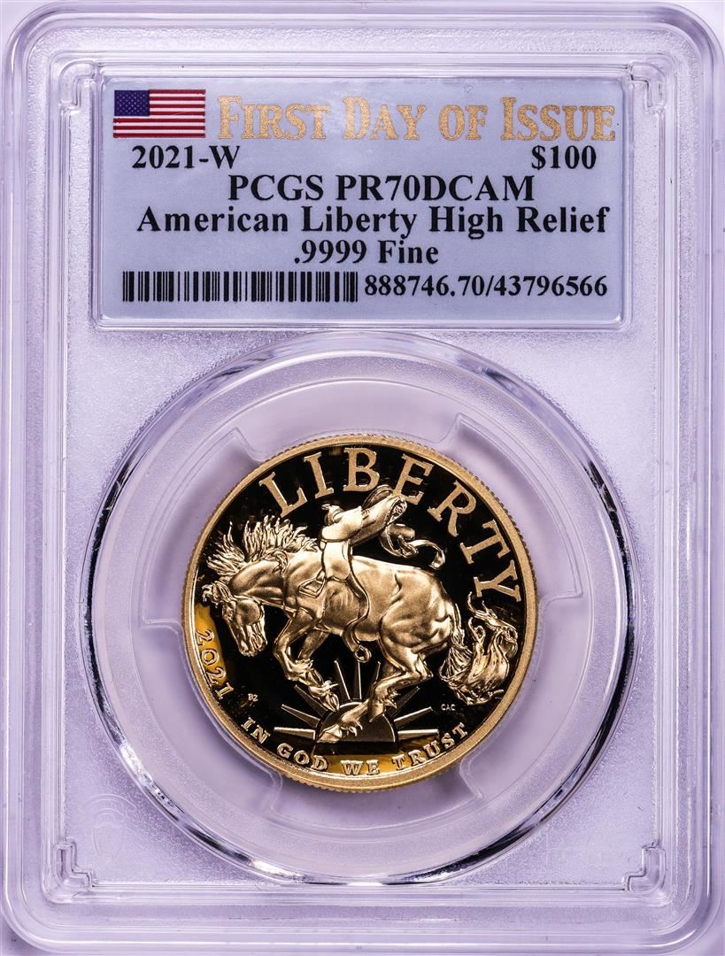 One 2021-W $100 American Liberty High Relief Gold Coin PCGS PR70DCAM First Day of Issue.