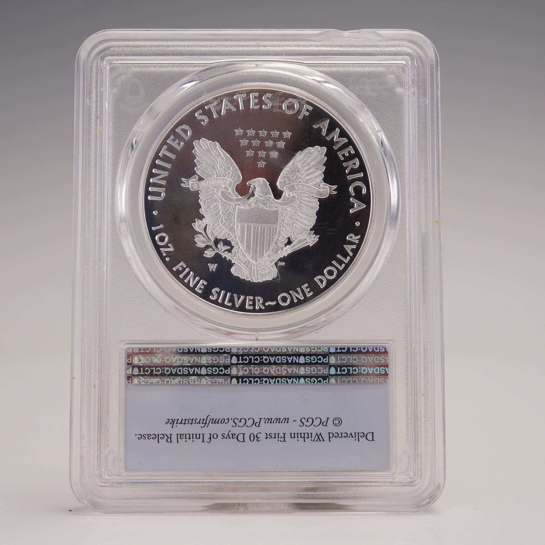 Certified by PCGS with a grade of PR70 DCAM and designated First Strike, This Type 1 issue contains one troy ounce of .999 fine silver and is designed on the obverse with Walking Liberty design showing Liberty striding forward with the folds of the flag around her, her right hand extended, and branches of laurel and oak in her left. The reverse, designed by John Mercanti (b. 1943), features the heraldic eagle with shield and thirteen five-pointed stars above. Encapsulation includes certification number.