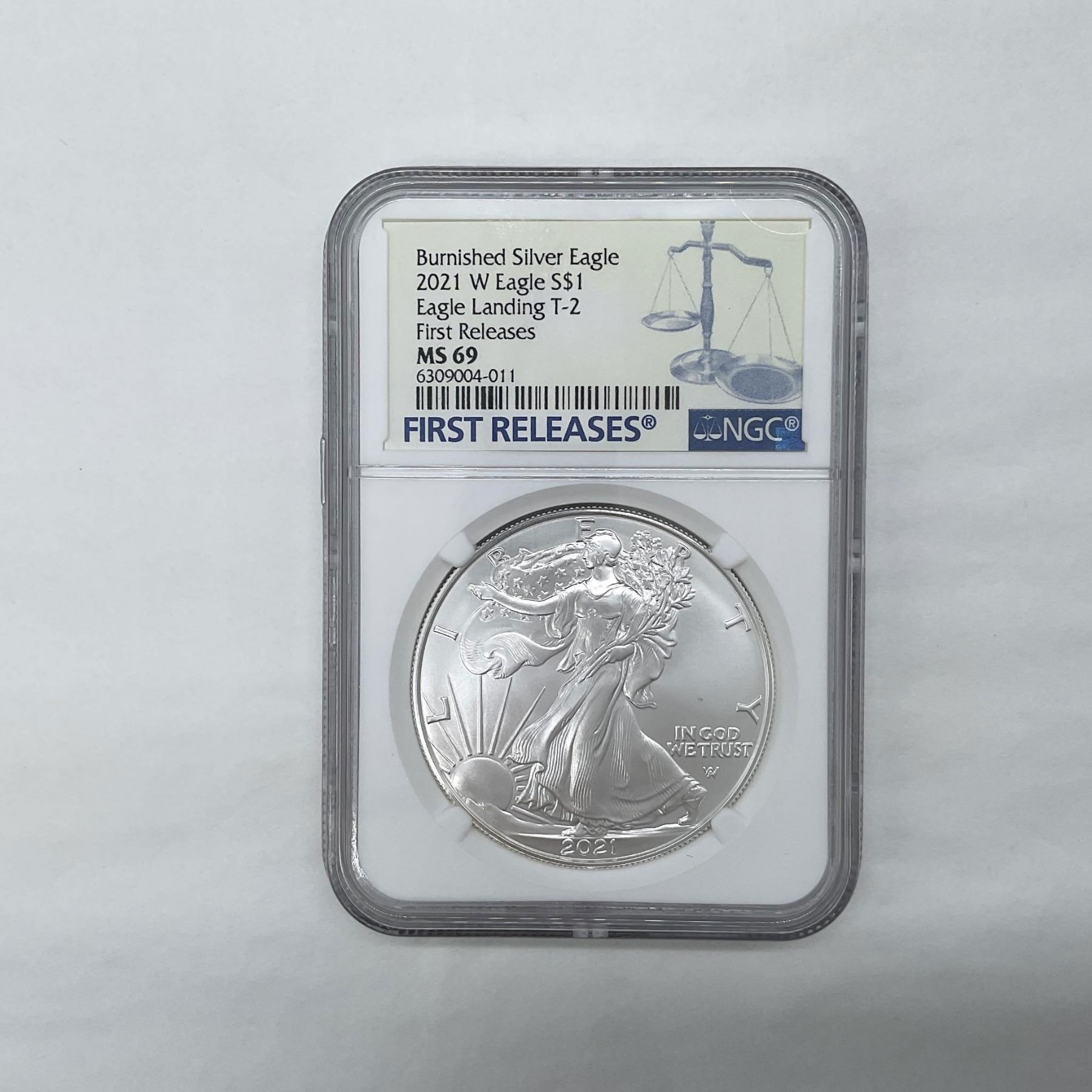 Slabbed MS69. Burnished Silver Eagle. First Releases. The obverse side depicts Liberty in full stride. She is shown wrapped in the flag, her right hand is extended and her left arm is carrying laurel and oak branches. The reverse side features a bald eagle carrying an oak branch. The coin is in a protective case. The case is approximately: 2.25"L x 0.5"W x 3.25"H.