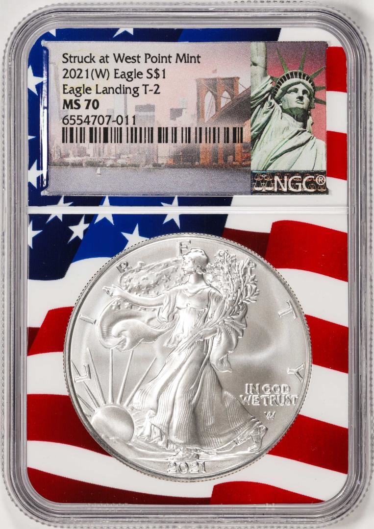 One 2021(W) Type 2 $1 American Silver Eagle Coin NGC MS70 Flag Core. NGC Certified.