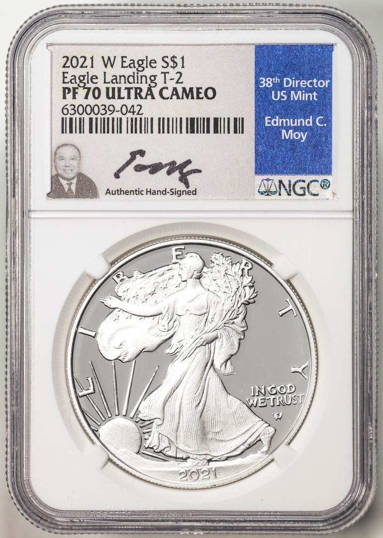One 2021-W Type 2 $1 Proof American Silver Eagle Coin NGC PF70 Ultra Cameo Moy Signature. NGC Certified.