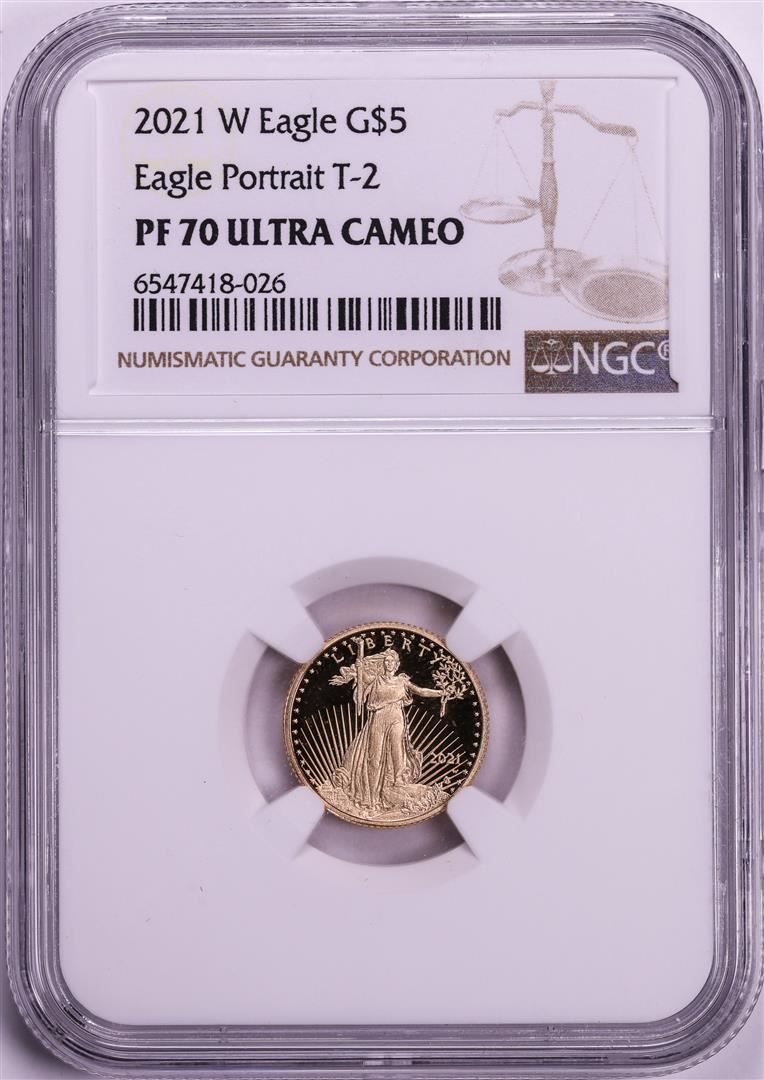 One 2021-W Type 2 $5 Proof American Gold Eagle Coin NGC PF70 Ultra Cameo. NGC Certified.