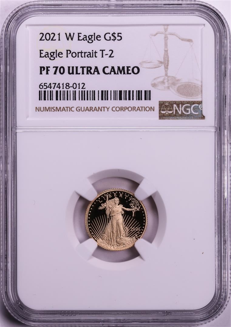 One 2021-W Type 2 $5 Proof American Gold Eagle Coin NGC PF70 Ultra Cameo. NGC Certified.