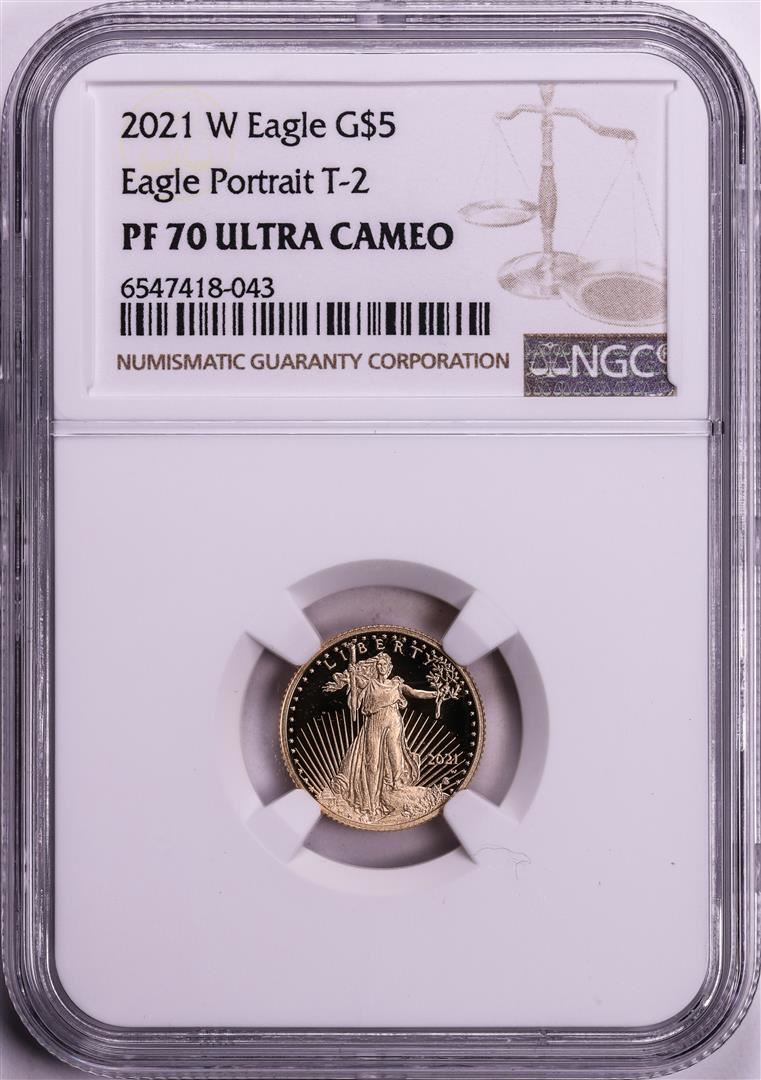 One 2021-W Type 2 $5 Proof American Gold Eagle Coin NGC PF70 Ultra Cameo. NGC Certified.