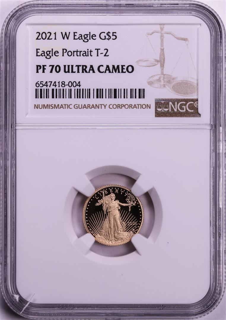 One 2021-W Type 2 $5 Proof American Gold Eagle Coin NGC PF70 Ultra Cameo. NGC Certified.