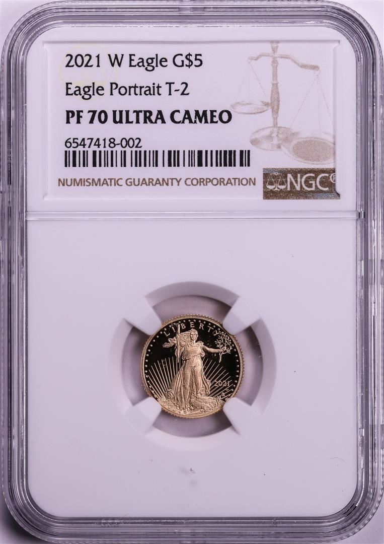 One 2021-W Type 2 $5 Proof American Gold Eagle Coin NGC PF70 Ultra Cameo. NGC Certified.