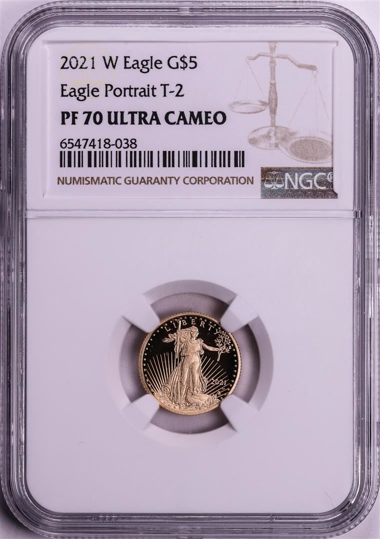 One 2021-W Type 2 $5 Proof American Gold Eagle Coin NGC PF70 Ultra Cameo. NGC Certified.