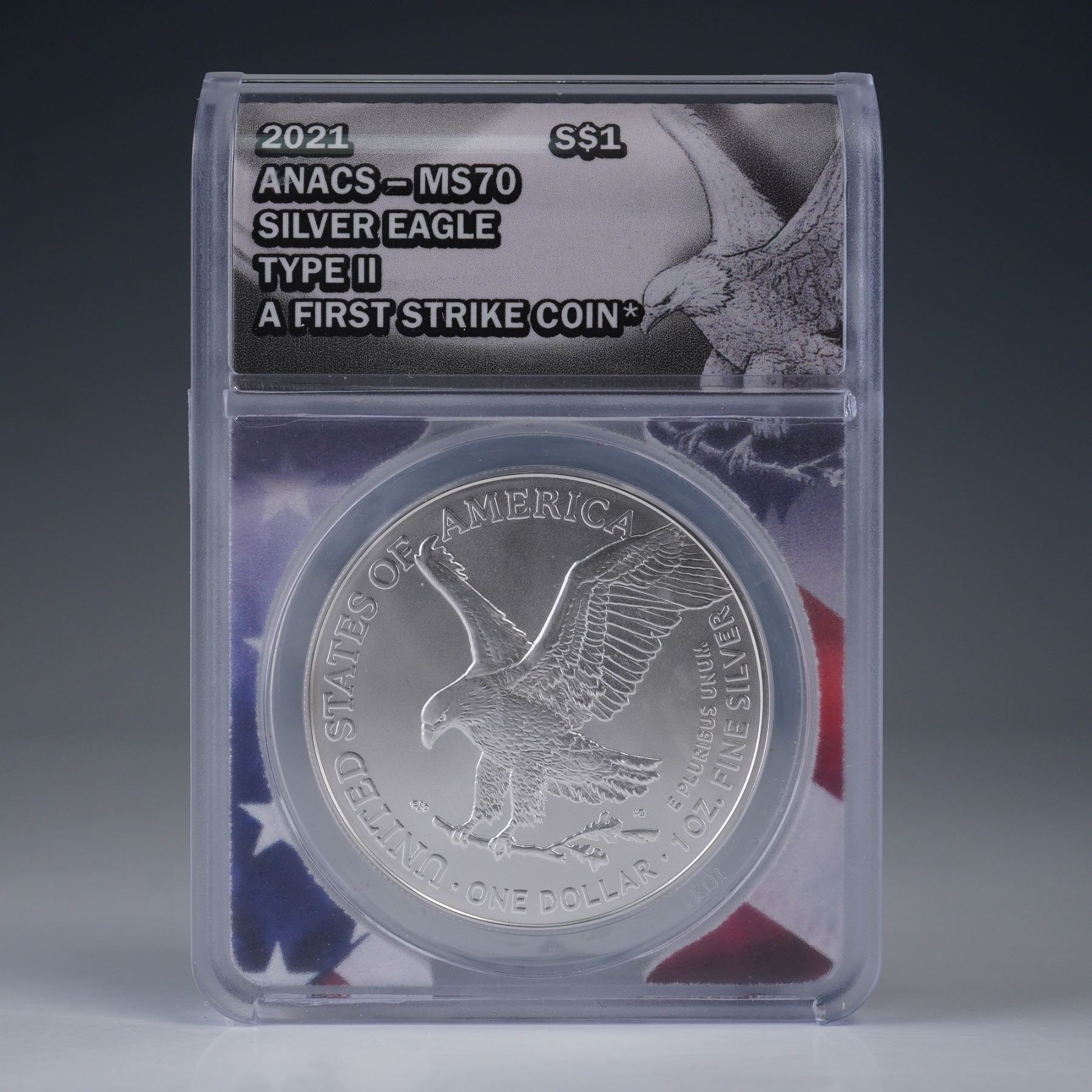 A stunning 2021 American Silver Eagle Type II one dollar coin, certified by ANACS in pristine MS70 condition and designated as a First Strike example. Struck in one troy ounce of .999 fine silver, this iconic coin features the updated Type II reverse design, showcasing a powerful eagle descending with an oak branch with the mottos "UNITED STATES OF AMERICA", "E PLURIBUS UNUM". The obverse maintains Adolph A. Weinman's revered "Walking Liberty" design inscribed with "LIBERTY", IN GOD WE TRUST", and dated "2021". Enclosed in an authenticated ANACS slab for protection. Slab measures: 2.25"L x 0.25"W x 3.25"H. Coin diameter: 40.6 mm.