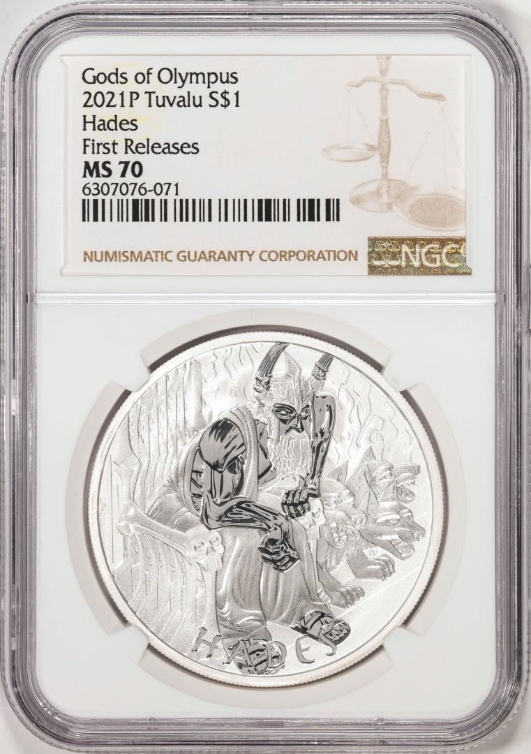 One 2021P Tuvalu $1 Gods of Olympus Hades Silver Coin NGC MS70 First Releases. NGC Certified.