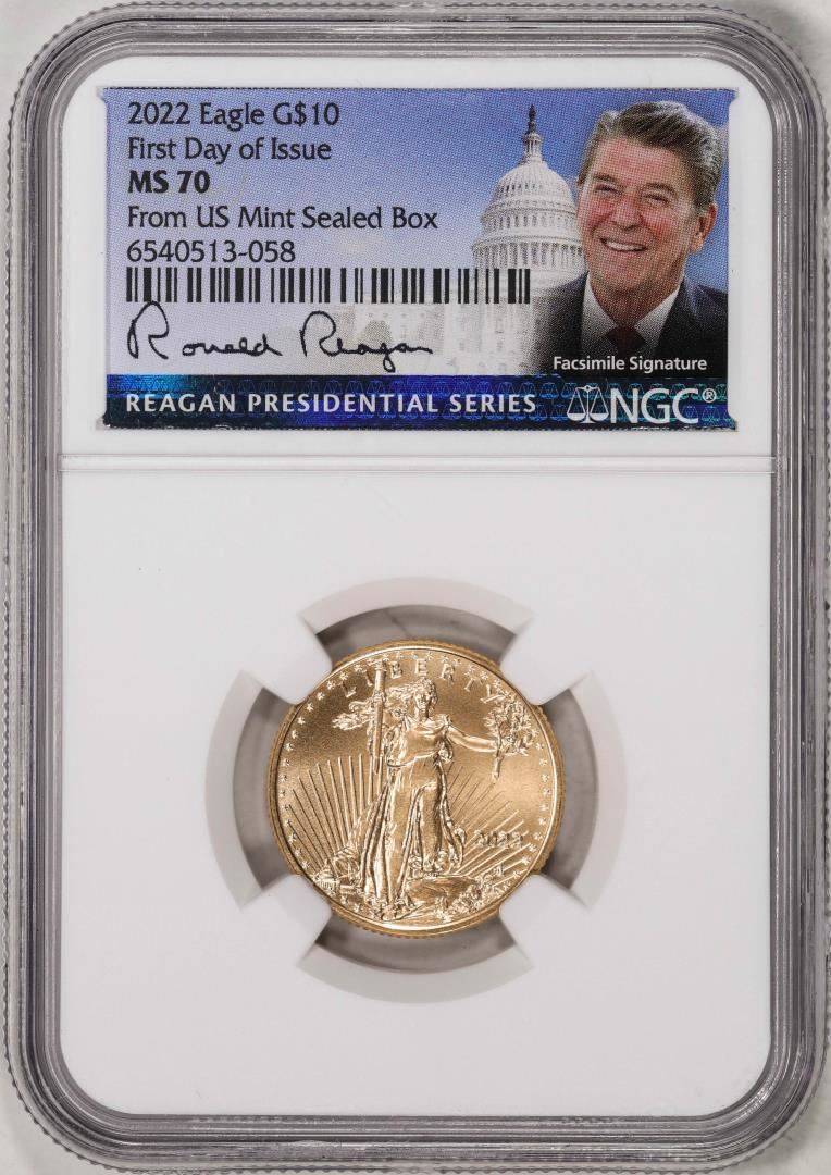 2022 $10 American Gold Eagle Coin NGC MS70 FDOI Reagan Legacy Series Signature