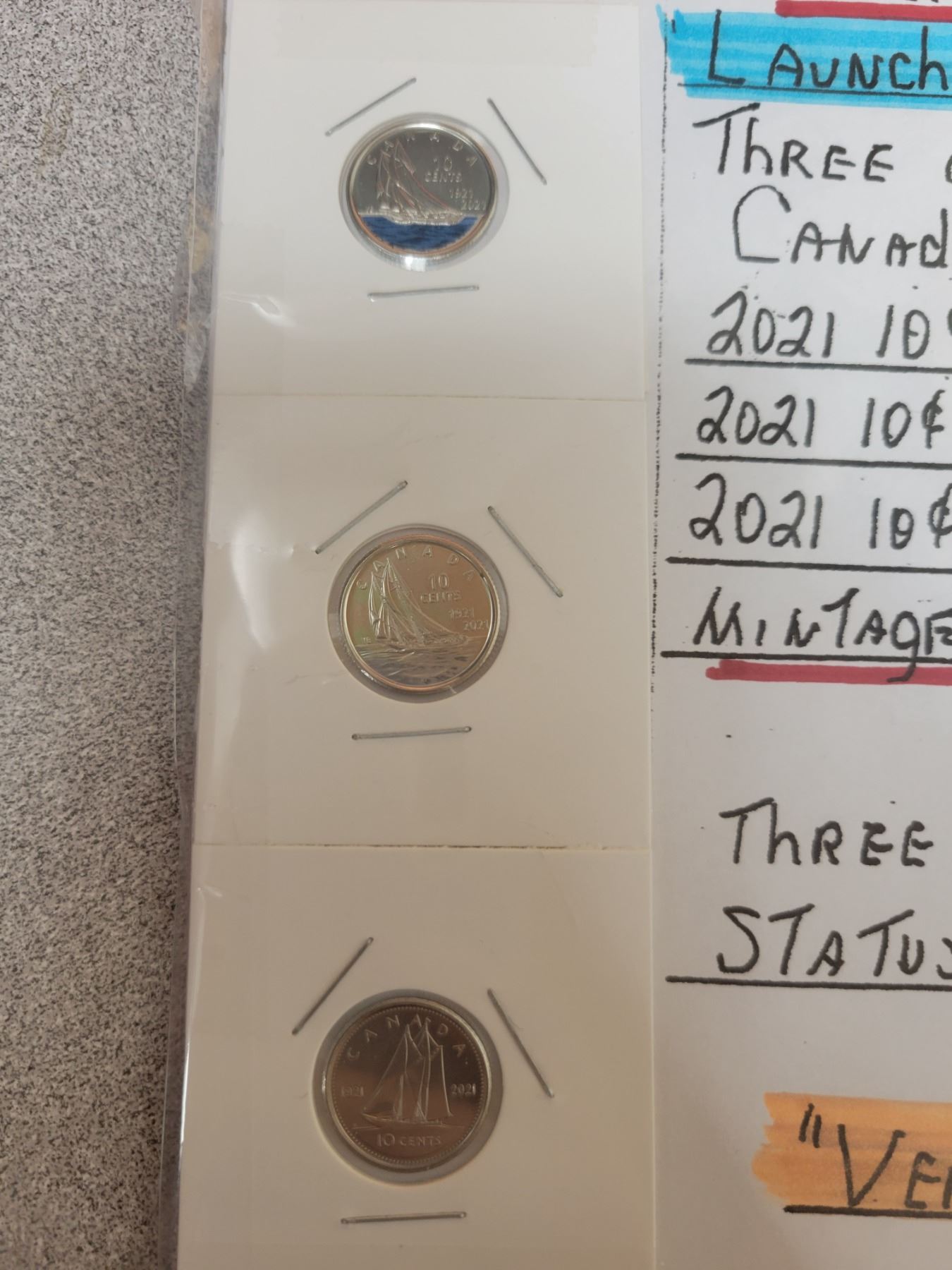 2022 100 year legacy 'launch of the Bluenose sailboat' three different Canadian 10¢ coins, color, non color & double dated