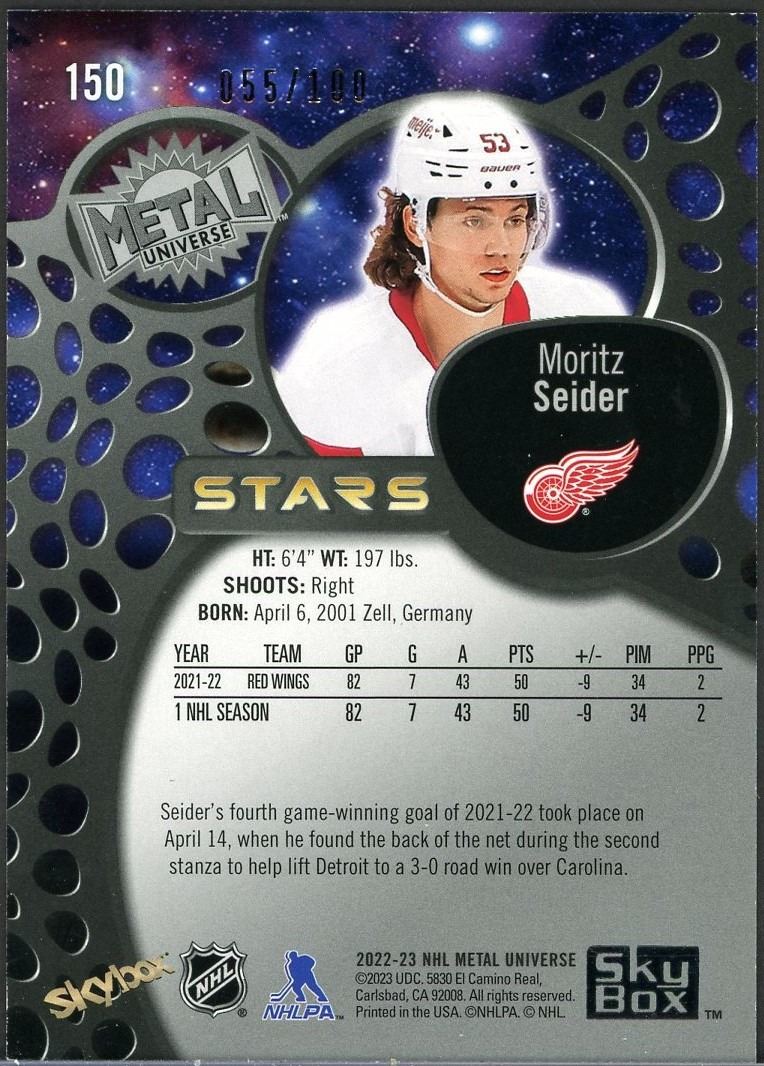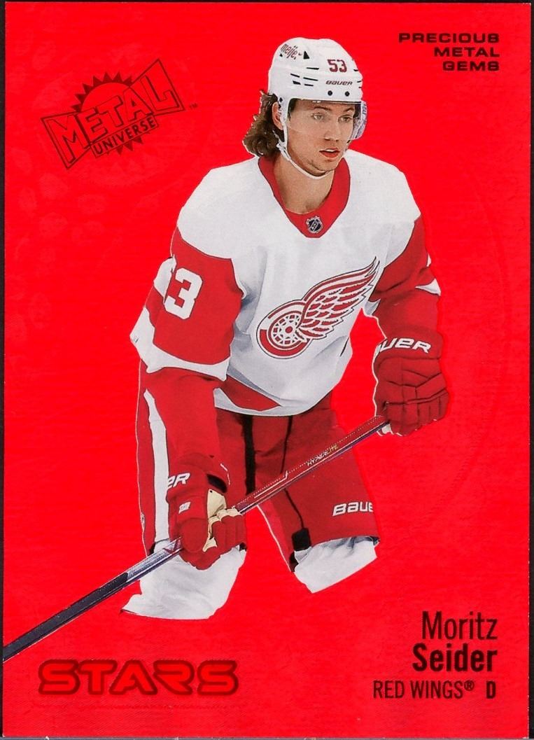2022-23 Skybox Metal Universe Red Precious Metal Gems SSP #'d to 100 of Redwings Star Moritz Seider!