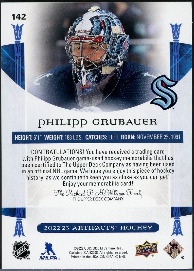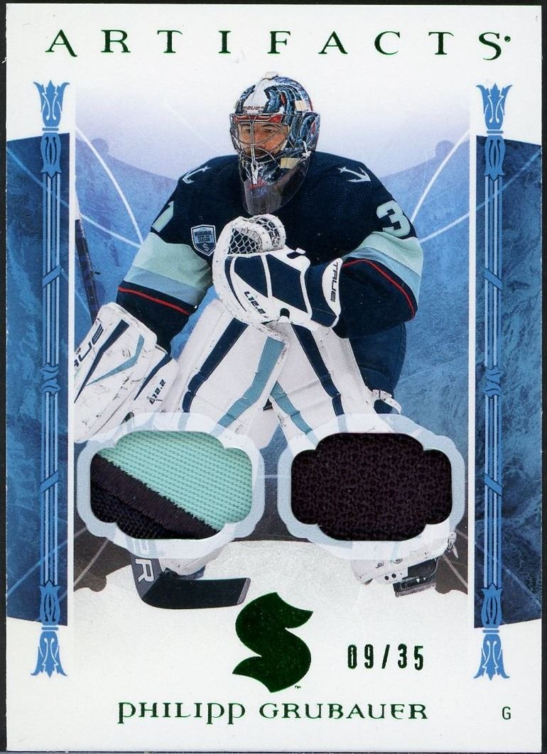2022-23 UD Artifacts dual game used patch card #'d to 35 of Seattle Kraken Goalie Philipp Grubauer