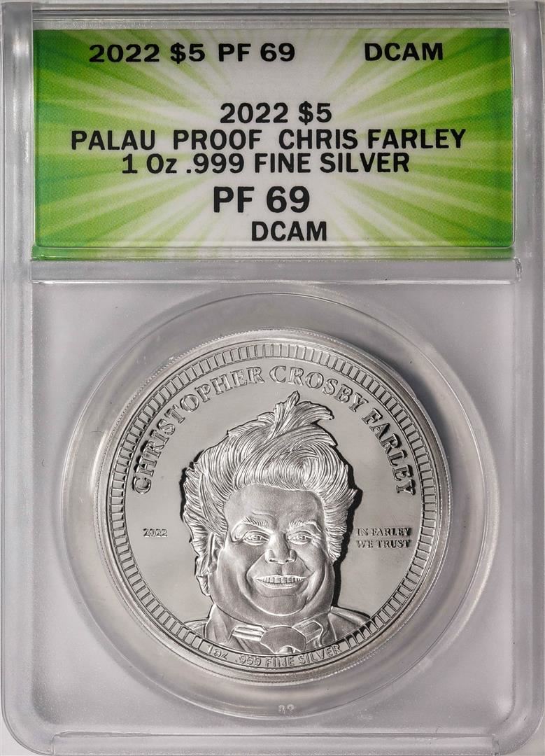 One 2022 $5 Palau Proof Chris Farley Silver Coin ANACS PF69DCAM. ANACS Certified.