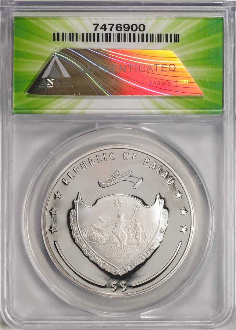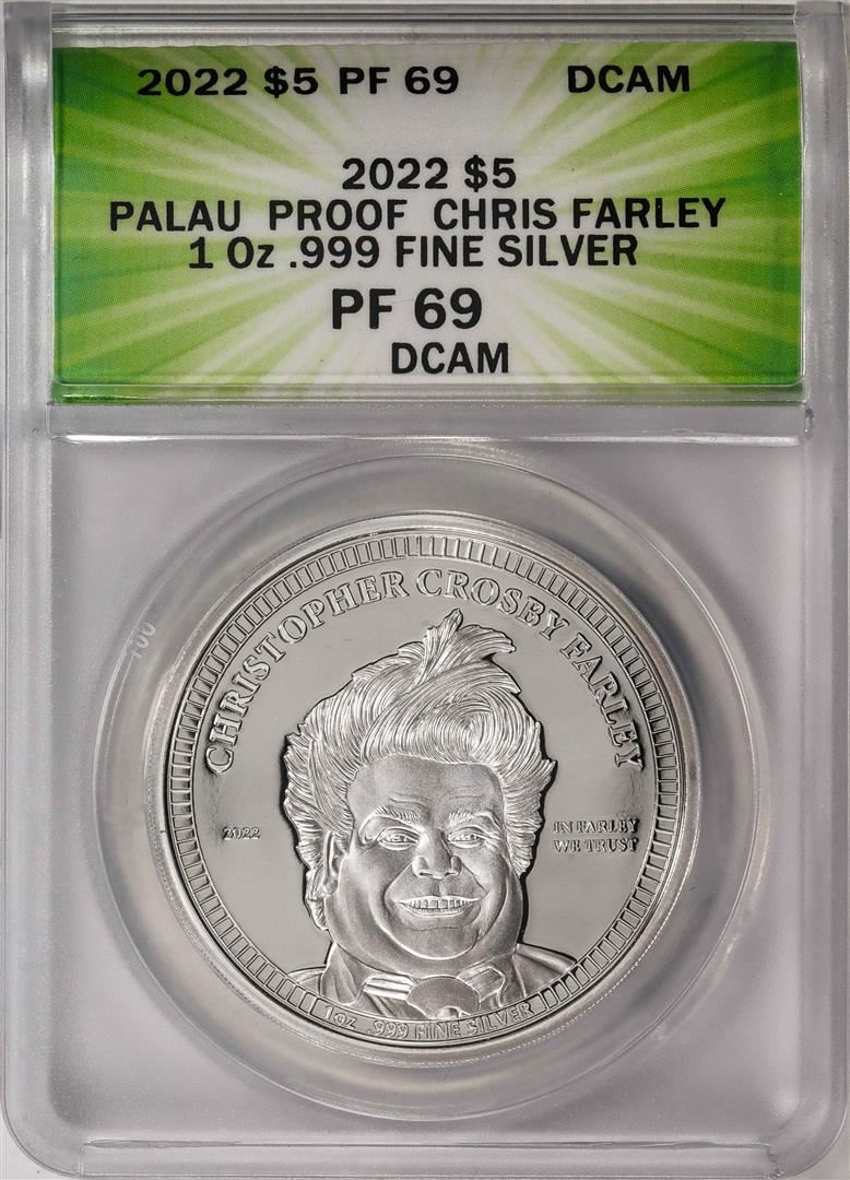 One 2022 $5 Palau Proof Chris Farley Silver Coin ANACS PF69DCAM. ANACS Certified.