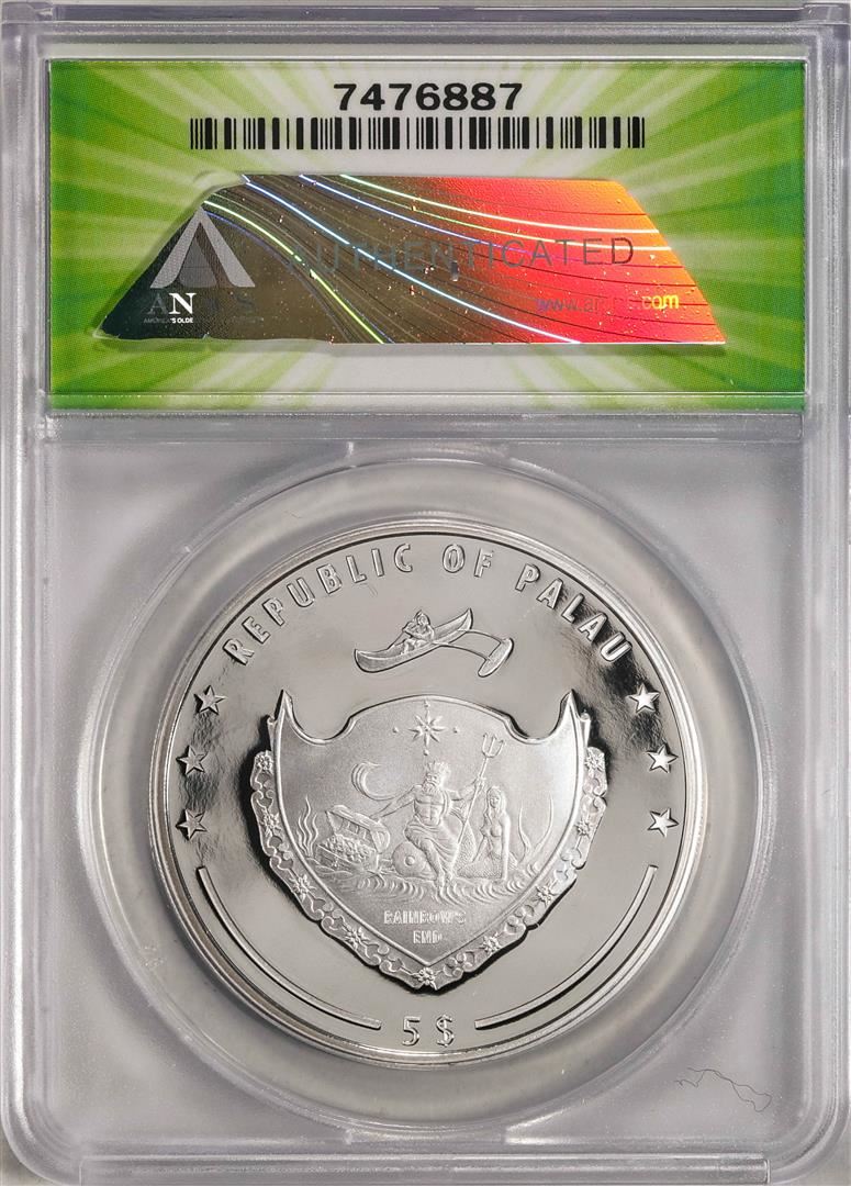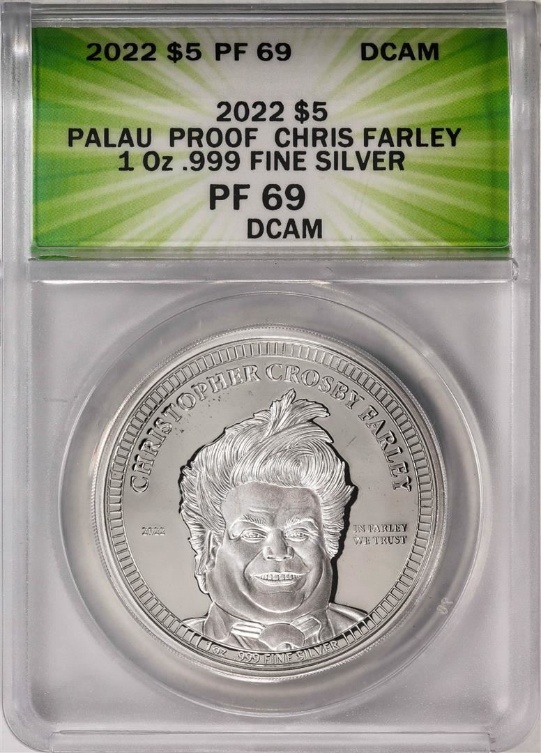 One 2022 $5 Palau Proof Chris Farley Silver Coin ANACS PF69DCAM. ANACS Certified.