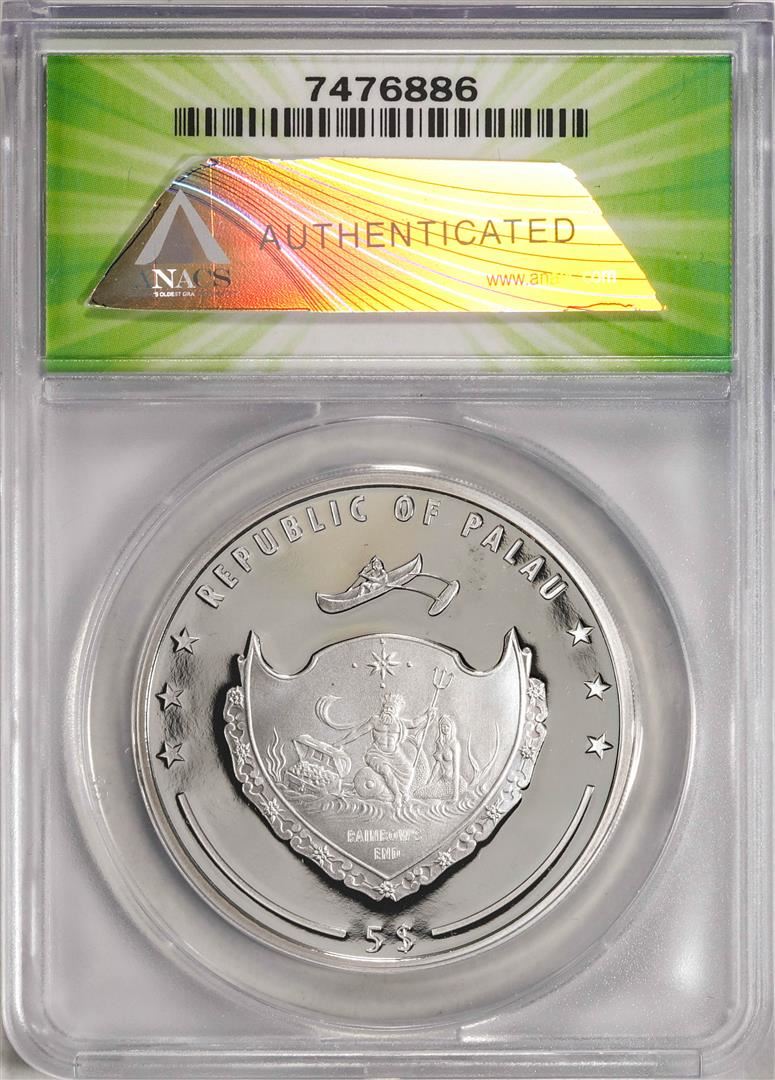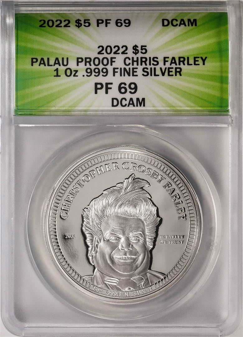 One 2022 $5 Palau Proof Chris Farley Silver Coin ANACS PF69DCAM. ANACS Certified.