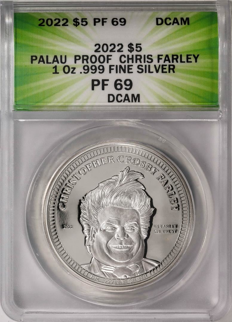 One 2022 $5 Palau Proof Chris Farley Silver Coin ANACS PF69DCAM. ANACS Certified.