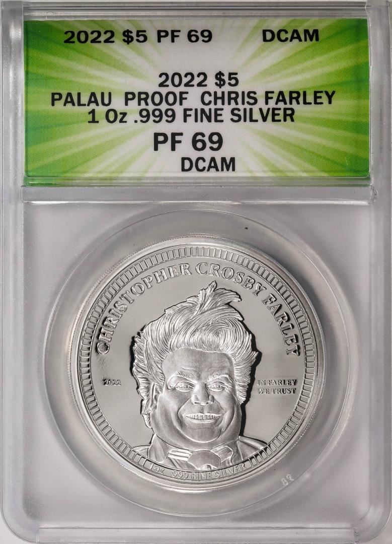 One 2022 $5 Palau Proof Chris Farley Silver Coin ANACS PF69DCAM. ANACS Certified.