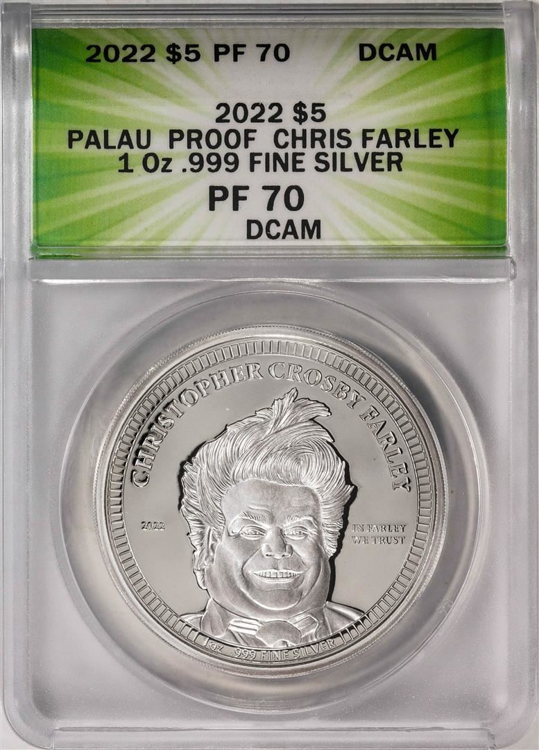 One 2022 $5 Palau Proof Chris Farley Silver Coin ANACS PF70DCAM. ANACS Certified.