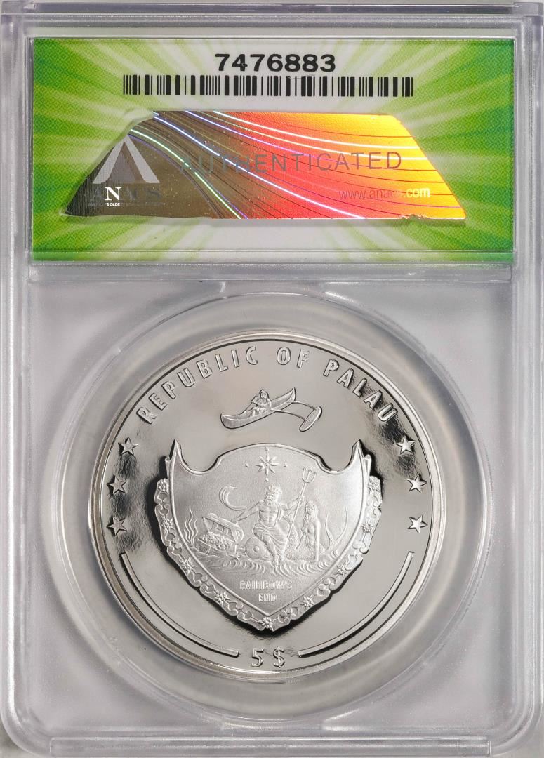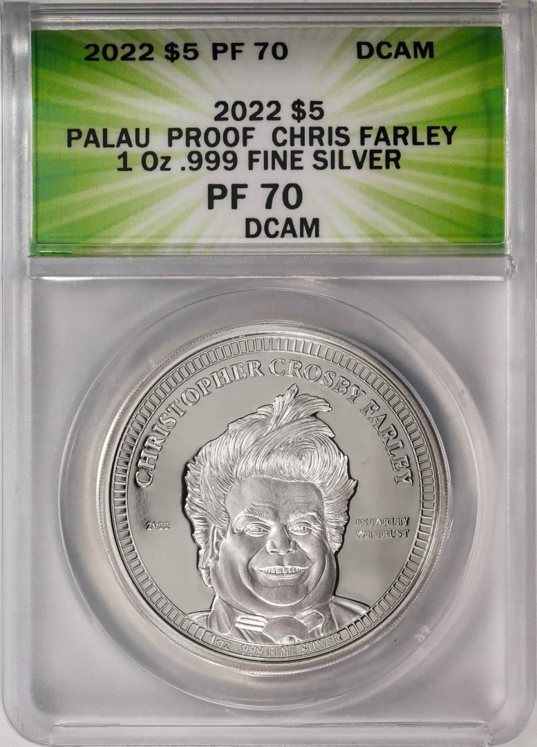 One 2022 $5 Palau Proof Chris Farley Silver Coin ANACS PF70DCAM. ANACS Certified.