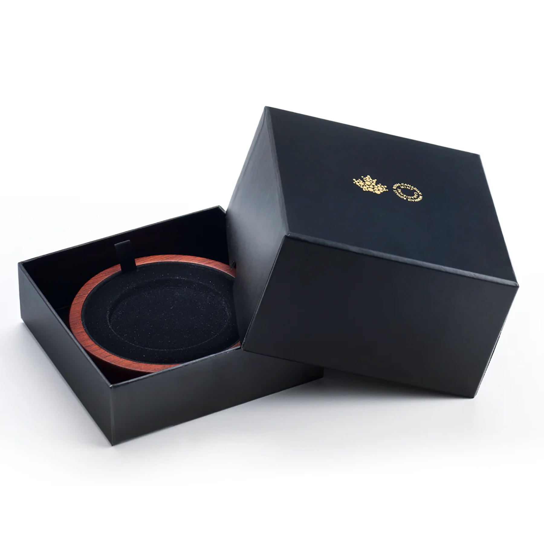Coin is 5oz and .9999 fine with gold plating and sterling silver 3D elements. Santa reviews his list while elves carry presents, tilt the coin and the elves will move around him! Sits on dark wooden base, housed in glass dome.