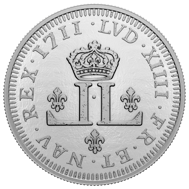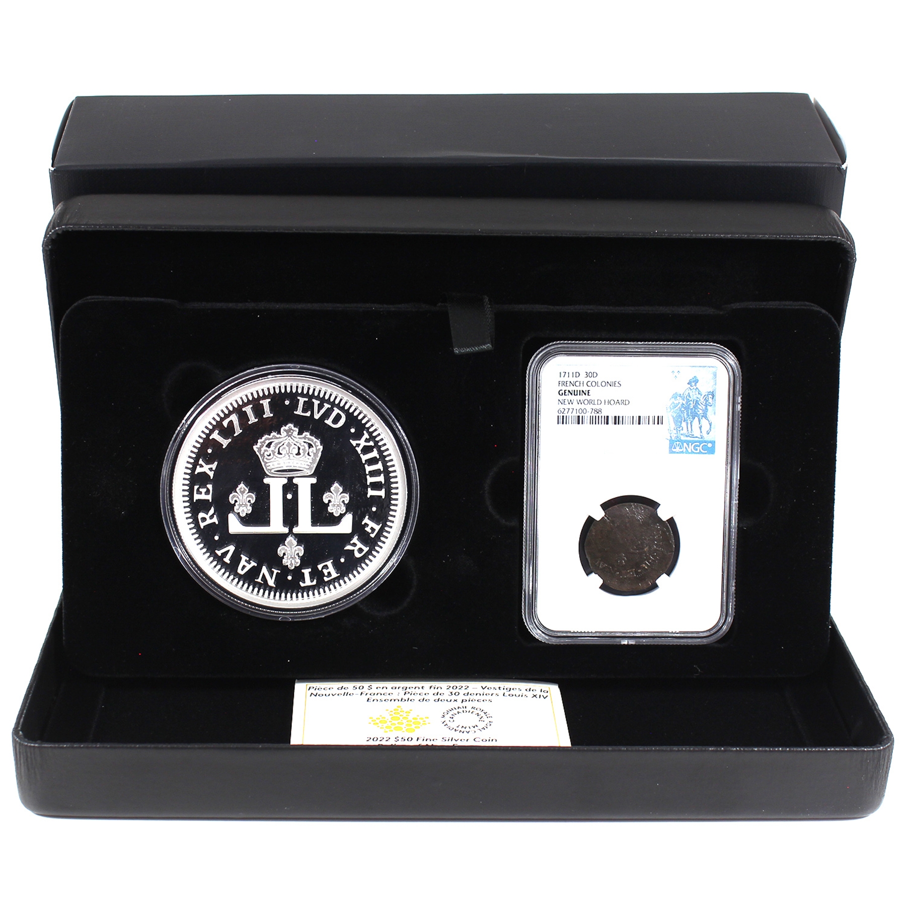 Set includes 5oz .9999 silver 1711 Louis XIV 30 deniers replica, and a genuine 1711 30 denier coin from the French Colonies.