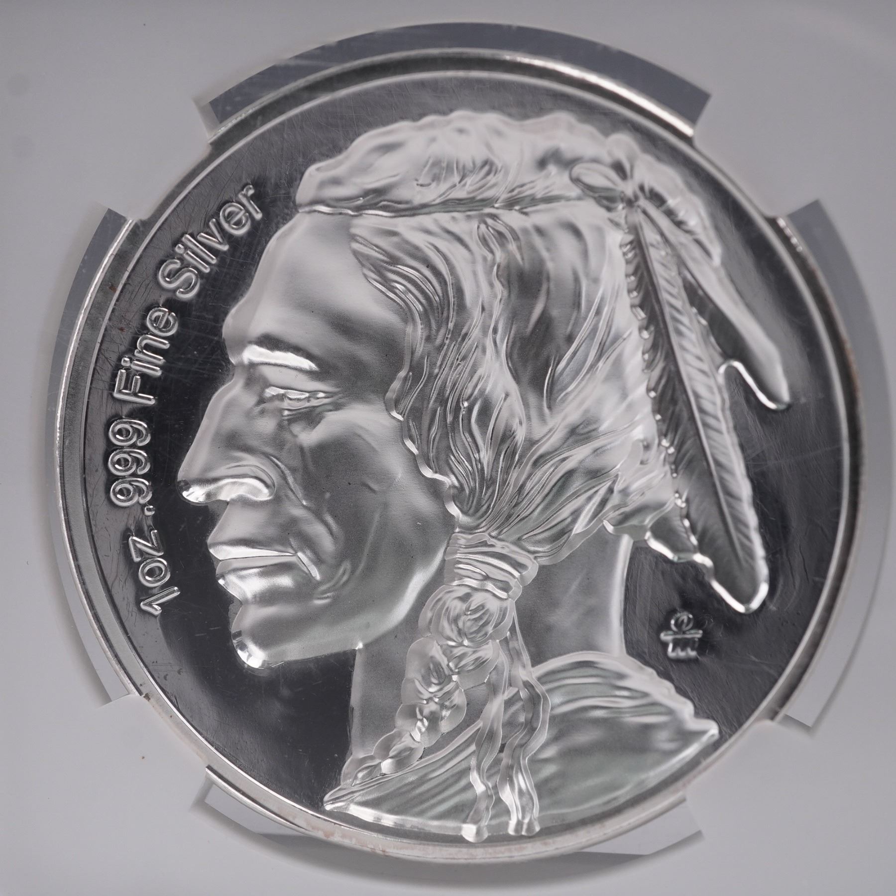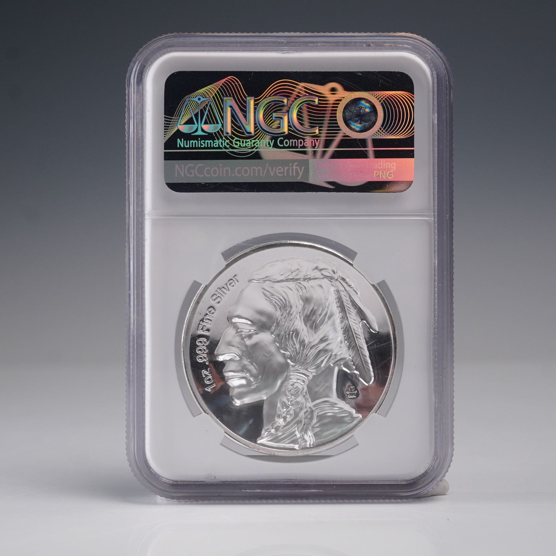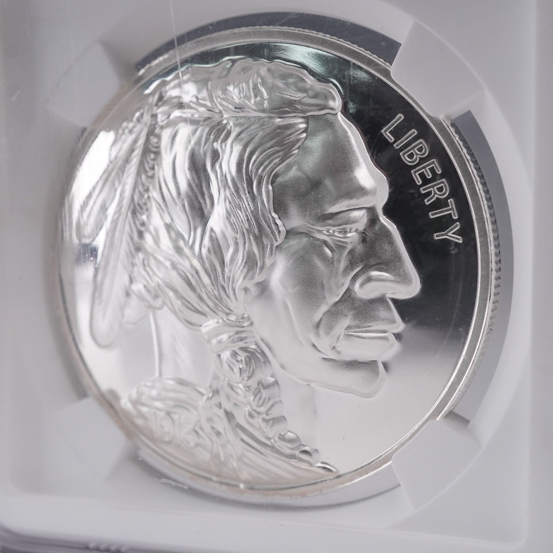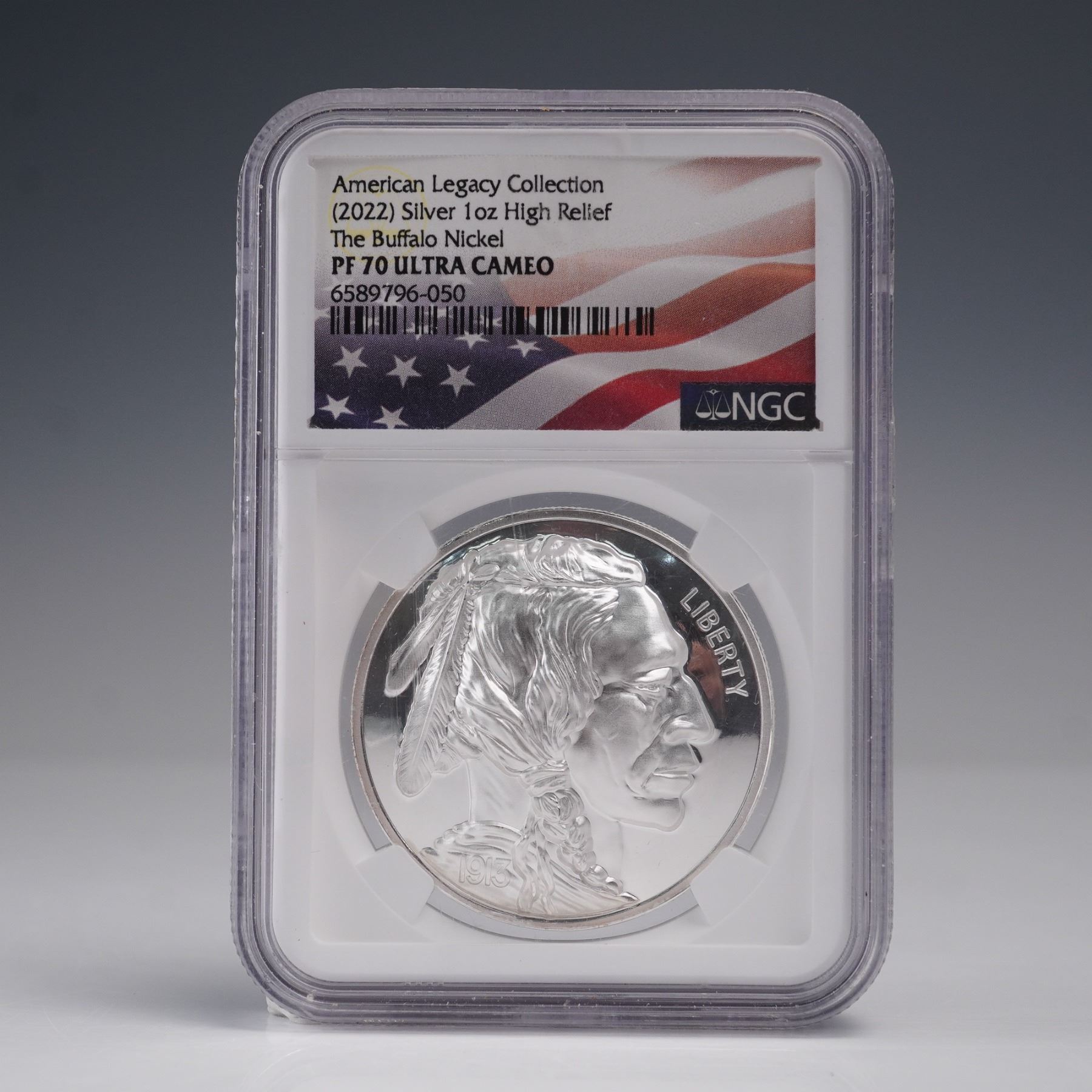 American Legacy Collection, 2022 one-ounce silver coin graded NGC with a flawless PF 70 Ultra Cameo. Meticulously struck in .999 fine silver. This coin exhibits the distinguished profile of a Native American chief adorned with traditional feathered regalia, marked with the word "LIBERTY" along the obverse and the year "1913" beneath the portrait in homage to the original design. The reverse continues the tribute with a mirrored field and frosted high-relief image, highlighting the craftsmanship and depth of this modern interpretation. Housed in a protective holder for preservation and authentication. Slab measures: 2.25"L x 0.25"W x 3.25"H.